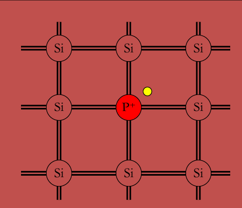 P原子替代Si原子,形成共价键,出现1个正电中心P+(不可移动)和1个多余的价电子。