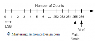The ADC needs a voltage reference to convert an analog signal into a digital word. Depending on the number of bits it has, the ADC divides the voltage reference in small levels called counts. For example, if this is an 8-bit ADC, the counts will look like those in Figure 1. In an 8-bit ADC there are 28 = 256 counts.